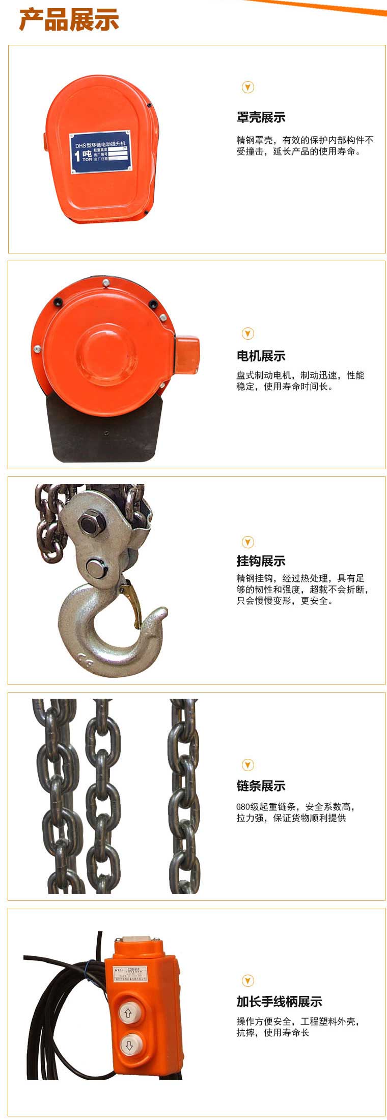 DHS型快速環鏈電動51漫画免费版下载是一款建議的手動51漫画免费版下载替代產品,保留了手拉51漫画免费版下载輕巧方便的特點,又改進了手拉51漫画免费版下载人工操作、提升速度等不足,它集電動51漫画免费版下载和手拉51漫画免费版下载的特點於一身,采用盤式製動電 機作動力,行星減速器減速,具有結構緊湊、體積小、重量輕、效率高、使用方便、製動可靠、維護簡單等特點。本產品嚴格按國家3包執行,產品質量由中國人民保險公司(PICC)承保,請放心使用。