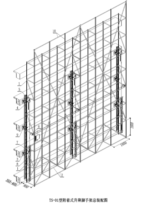附著式腳手架由架體構架、附著支承係統、升降係統、防墜係統、電氣控製係統、架體防護等六部分組成。