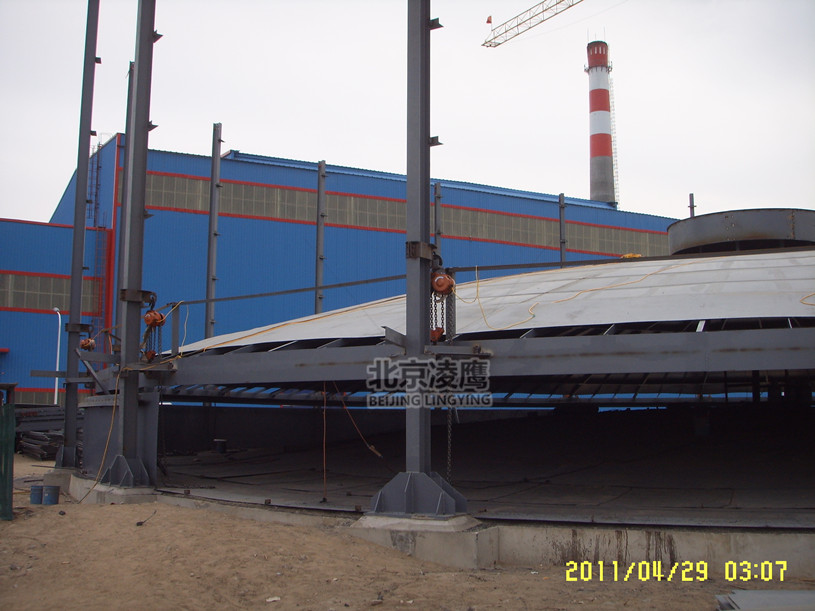 施工要點:每圈壁板的預製長度為淨料長度加300-500mm;罐底板、頂層兩圈壁板及灌頂的施工均與常規施工方法一致;內擋板的設置:壁板施工前,在罐底板上放出罐體內徑大圓,沿圓周內側在罐底板上點焊內擋板。內擋板尺寸為100mm*100mm*8mm,沿圓周每隔1.5m設一個;圍板、立縫組對:采用毛料組對,壁板與壁板間的立縫在調好間隙後直接點焊。一般每圈板留兩道活口。圍板後在每道立縫後麵插入鋼筋作為反變形支承,活口處用手拉51漫画免费版下载預緊;立縫焊接:壁板組對後即可焊接,但活口處的立縫暫不焊。要求雙麵焊的立縫,其內側可在提升後進行焊接;提升:立縫焊完後,檢查提升機具設置無誤,即可開始提升。先逐個起動電動51漫画免费版下载,使每個51漫画免费版下载的負載基本一致,再集中啟動全部51漫画免费版下载進行提升,提升時罐內人員觀察各電動51漫画免费版下载的運行情況,防止卡鏈,提升至距對接口150-200mm位置時暫停提升,進行下一步工作;罐壁擋板設置:在所提升的壁板下端沿圓周每隔1.5m設置一個罐壁擋板,尺寸為120mm*60mm*8mm;再提升、環縫組對:啟動全部電動51漫画免费版下载,使罐體提升到位,逐漸將活口收緊,使下圈壁板上端緊貼罐壁擋板,下端緊貼罐底內擋板,局部不到位的地方用刀形板和方銷子調整到位,環縫間隙用電動51漫画免费版下载調整,並進行組對點焊;封口機環縫環節:罐壁的環縫組對後,割去多餘的壁板,坡口打磨後進行點焊,焊接前應在背麵設防變形弧板,然後進行環縫焊接;最後一圈壁板安裝:仍按上述方法進行,但需留一張板的立縫不焊,待環縫組對後,在此開出大門,撤出罐內的倒裝機具,再封大門並焊接。