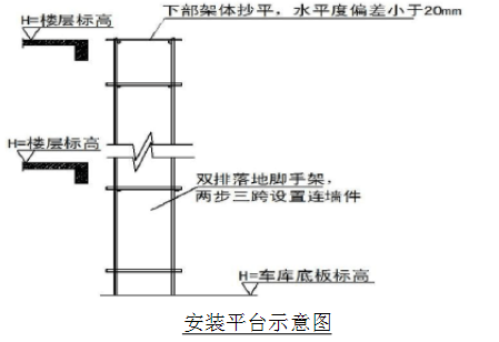 爬架安裝:爬架搭設前,采用落地架作為安裝平台,詳見下圖,來承受安裝時的豎向荷載,平台寬度1.5m。承受荷載大於3kn/m2,其水平度偏差應在20mm之內。
