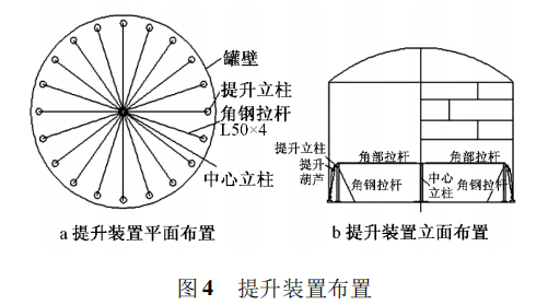 油庫改擴建的工程中,從儲油罐安裝選用的方法、提升裝置、整體受力分析及安裝過程下手。提升裝置的選用其中非常重要的一個環節。