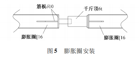膨脹圈采用16滾弧製成,根據罐體周長分若幹節製作,本工程分為4等分,膨脹圈安裝時,在膨脹圈4等分位置處用416t千斤頂將膨脹圈頂緊,使其緊貼在罐壁上,通過龍門卡具將膨脹圈與罐壁固定成一體,龍門卡具沿著膨脹圈每隔1m設置一個,膨脹圈用千斤頂頂緊的4個位置應避開倒裝立柱。膨脹圈製作成型後的曲率應和罐內壁的曲率一致,膨脹圈安裝如圖5所示。