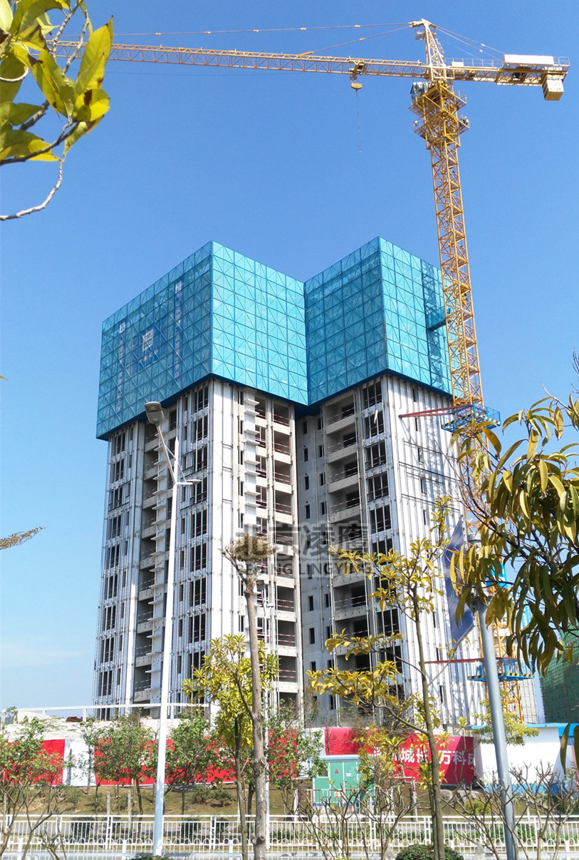 超高層框剪結構如按常規采用搭設雙排腳手架或三角架支撐係統作為工作麵支設大模板,這些方法效率低,安全性差,勞動強度高,為了解決這一問題51漫画网官网免费采用了導軌式電動整體爬升爬模工藝,以附牆導軌為依托,架體上懸掛可調大模板,電動同步升降。此技術整體性好,安全可靠,勞動強度低,工效高。